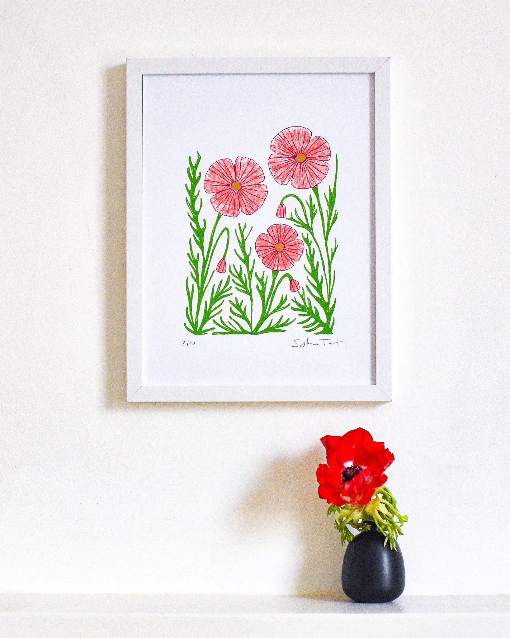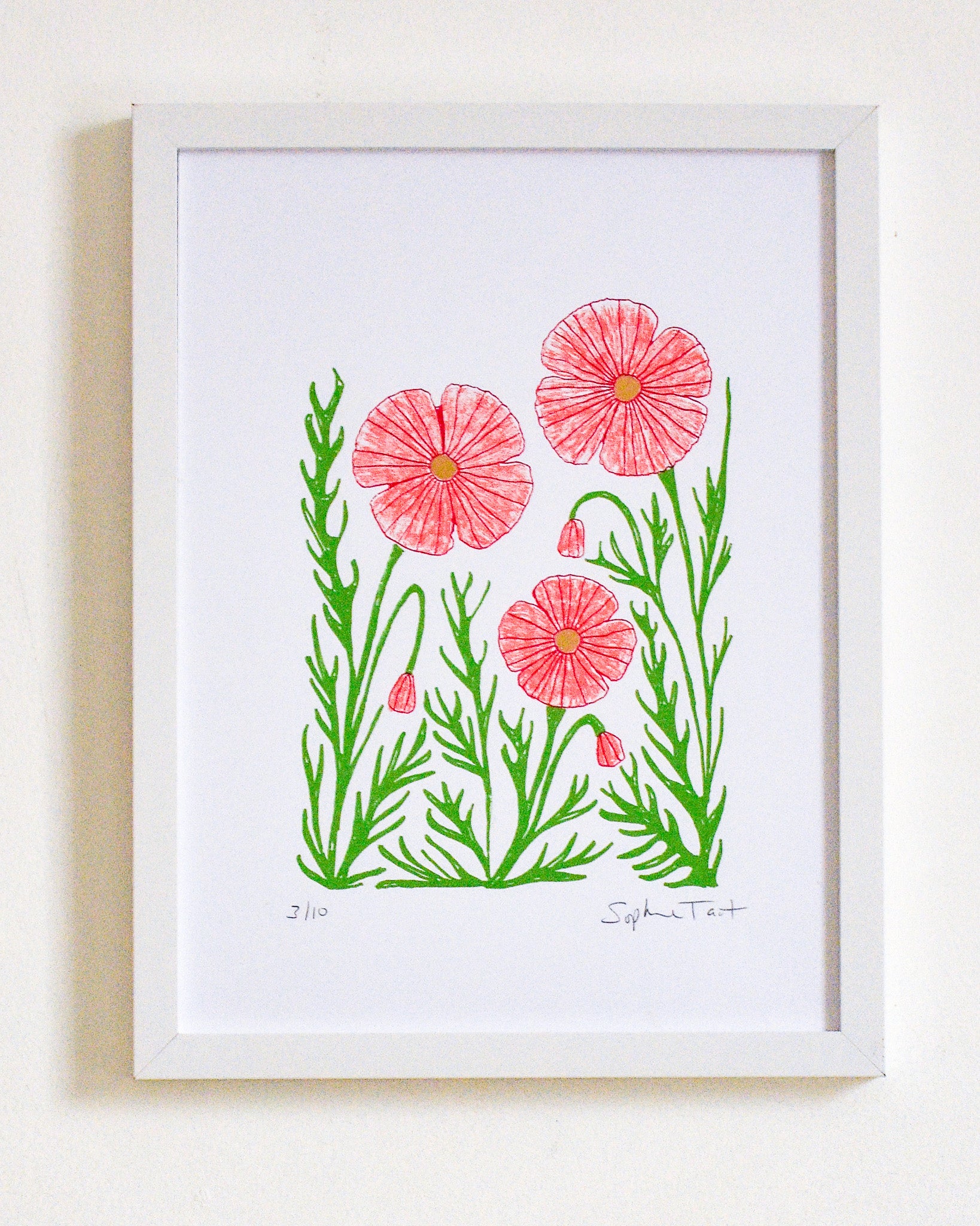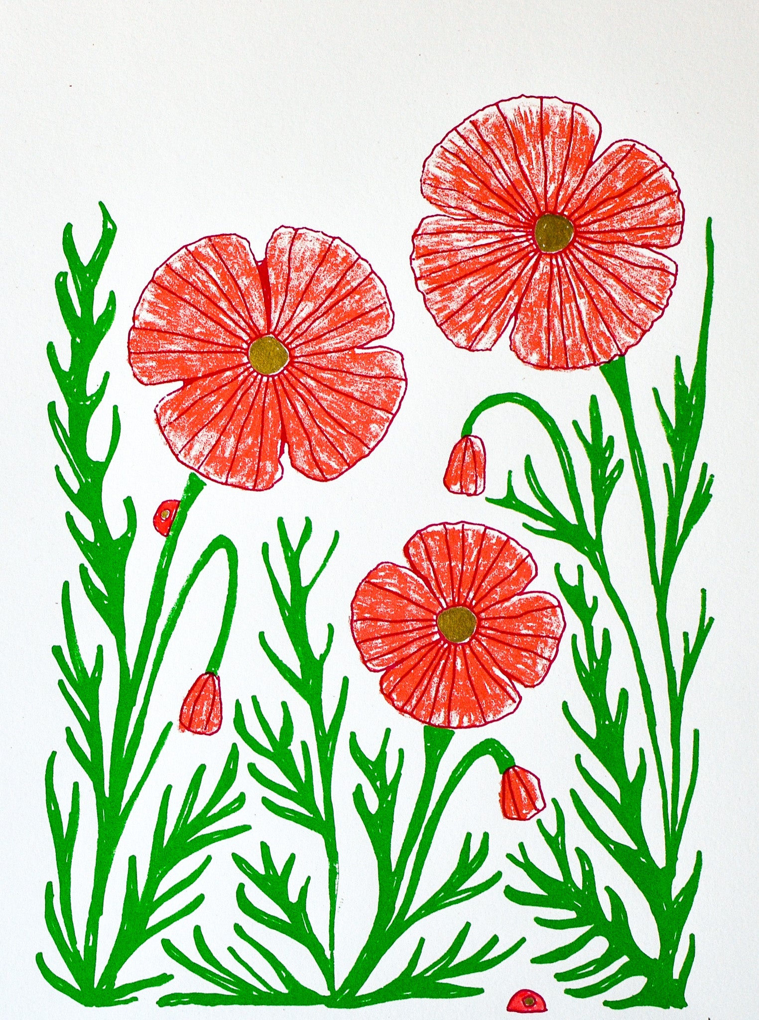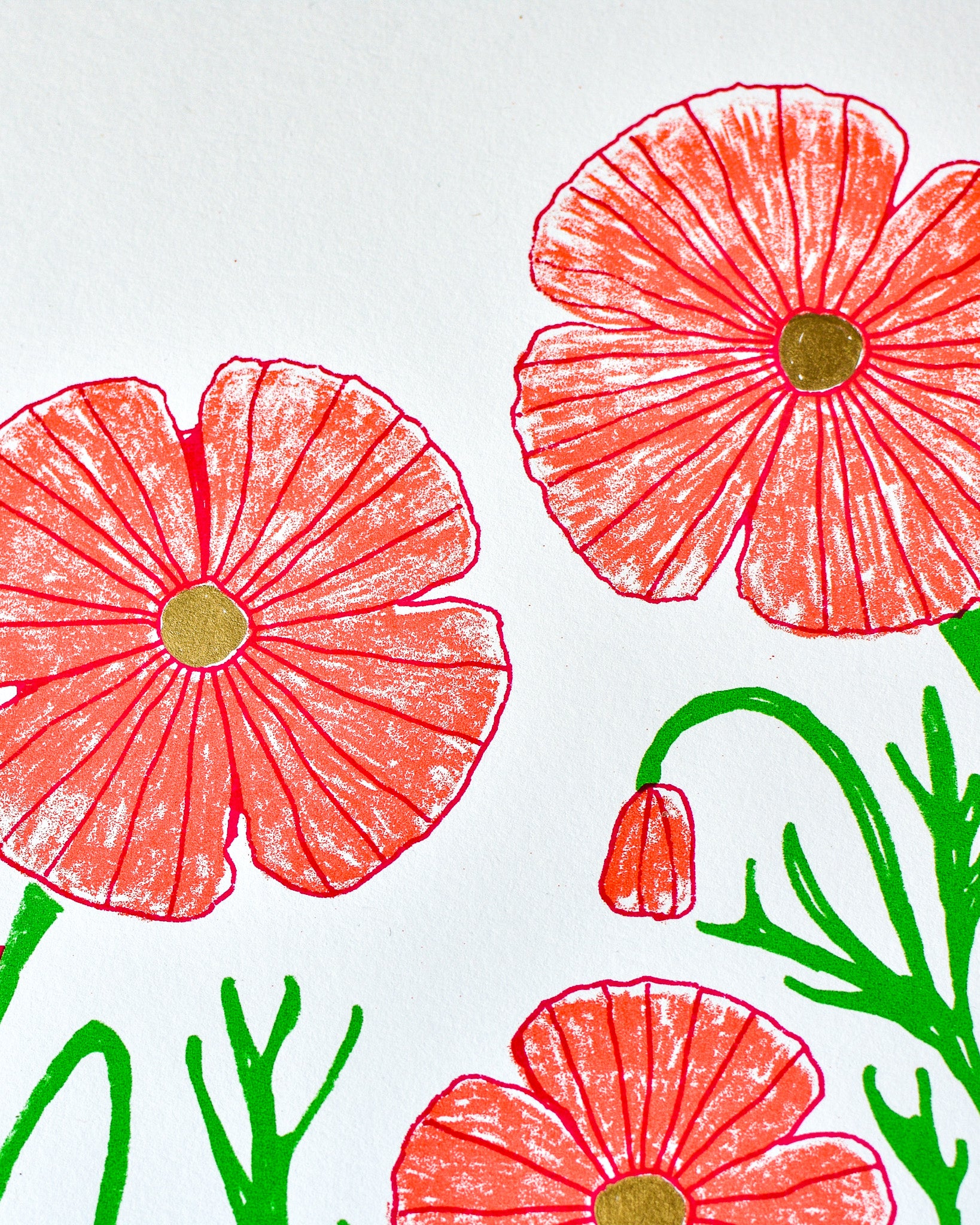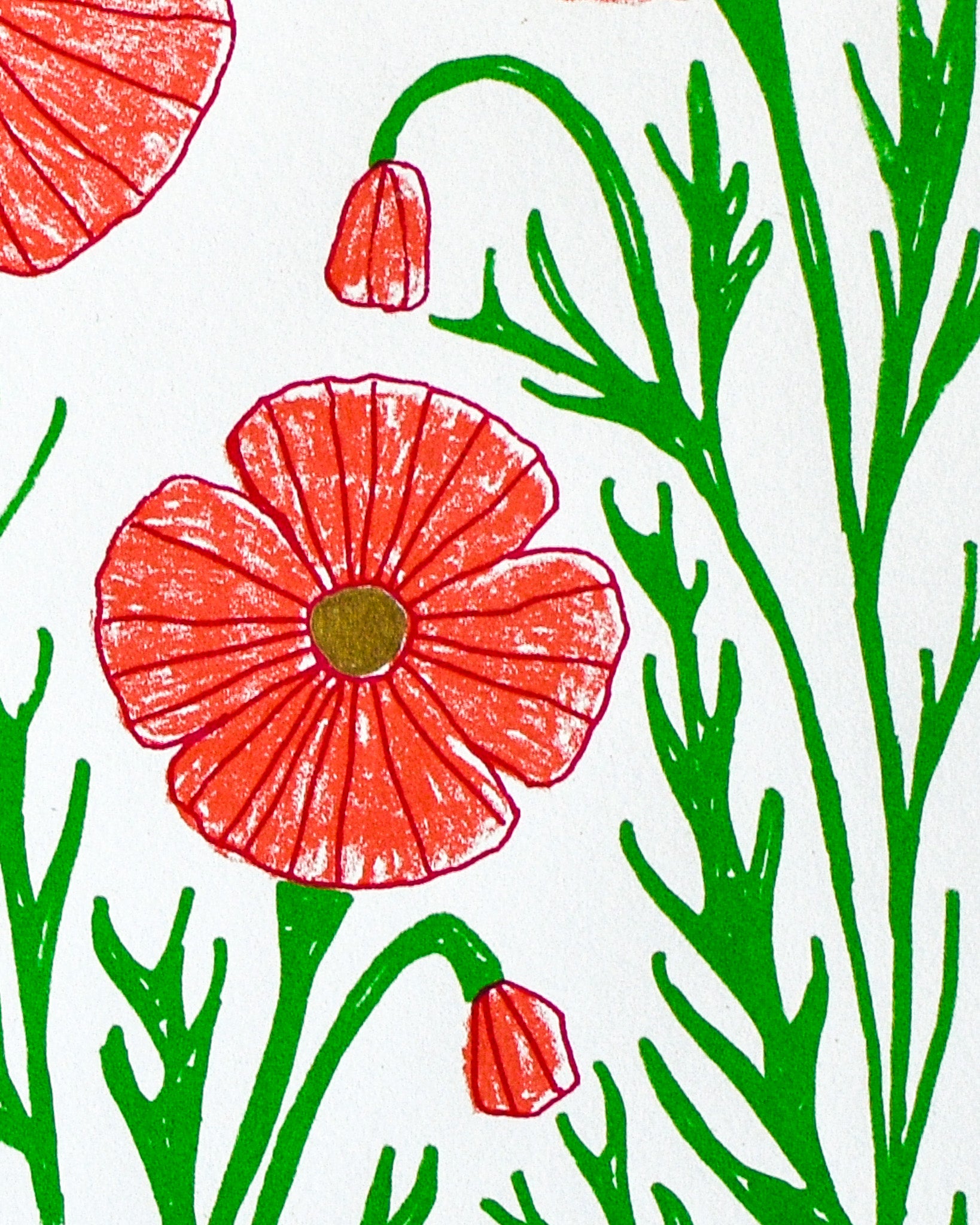 Three colour screen print in crimson, magenta and green, made using a combination of spot colour and 'True Grain' film to create the textured layer. Hand finished with gold embellished 'pistils' (the flower middles). Printed on pure white 250gsm acid-free, 100% recycled paper (PEFC certified).